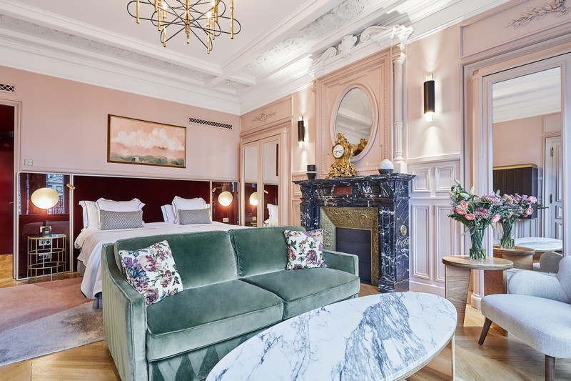 Cet hôtel des Champs-Elysées inauguré en 1920 incarne toute l’élégance de la Belle Époque. Partout, on aime les parquets, le mobilier aux formes courbes, les velours et leurs coloris doux. Il s’en dégage une atmosphère douce et feutrée que l’on retrouve dans les 50 chambres et suites, toutes avec moulures et cheminées d’époque, et déclinées en rose poudré, vert céladon ou bleu selon les étages. Le mobilier est un hommage au design des 100 dernières années, et les matériaux (peinture laquée, laiton vieilli, marbre, chêne et noyer) comme les tissus (velours et soie) font de ces chambres de véritables cocons de luxe et de confort.